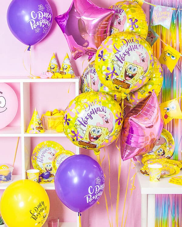 Губка Боб квадратные штаны, фраза которую знаю взрослые и дети по всему миру. Мультик про жёлтую губку, кормящую бургерами огромное количество морских жителей и обожающая свою работу. На данную тематику разработаны декарации из шариков, которые украсят любой праздник взрослых и детей.