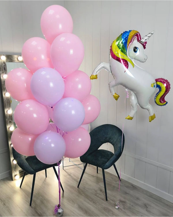Набор шаров «Прекрасная единорожка». В набор два фонтана из шаров и шар одиночка. Один фонтан состоит из двух латексных шаров без рисунка ярко-розового цвета, трех шаров нежно-розовой окраски из латекса, двух латексных белых шаров, двух латексных бело-розовых агат шаров, двух фольгированных шаров в форме звезд зеленого и розового цвета. Второй фонтан аналогичный. Связываются шары между собой розовыми ленточками. Шар одиночка, фольгированный большого размера в форме головы единорога белого цвета. Рог имеет золотой полосатый окрас, а грива розовая с блестками. На шее нарисованы маленькие цветочки оранжевые и желтые.
