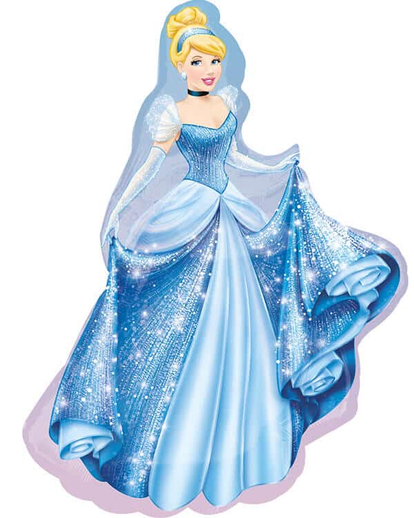 Букет из шаров по мотивам мультика «Золушка». В букете один фольгированный шар в форме Золушки в бальном платье, шесть латексных однотонных шаров голубого цвета, три прозрачных шарика с розово-голубым конфетти внутри. Шарики собираются в букет с помощью белых ленточек.