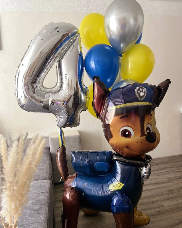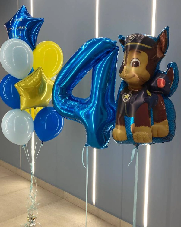 Набор из воздушных шаров на 2 годика для мальчика. В наборе 2 одиночных шара, один ходячий шар и один фонтан. Ходячий шарик имеет высоту 140 см и сделан из фольги в форме одного из щенков мультика «Ходячий патруль», а именно щенка по кличке Гончик. Один шар цифирный большой красного цвета в форме цифры 2. Один шар круглый фольгированный красного цвета с рисунком щенка в пожарной форме по кличке Маршал. Фонтан состоит из: двух красных фольгированных звезд, одной звезды из фольги синего цвета, двух синих и трех красных латексных шаров и двух прозрачных латексных шаров внутри с золотыми блестками.