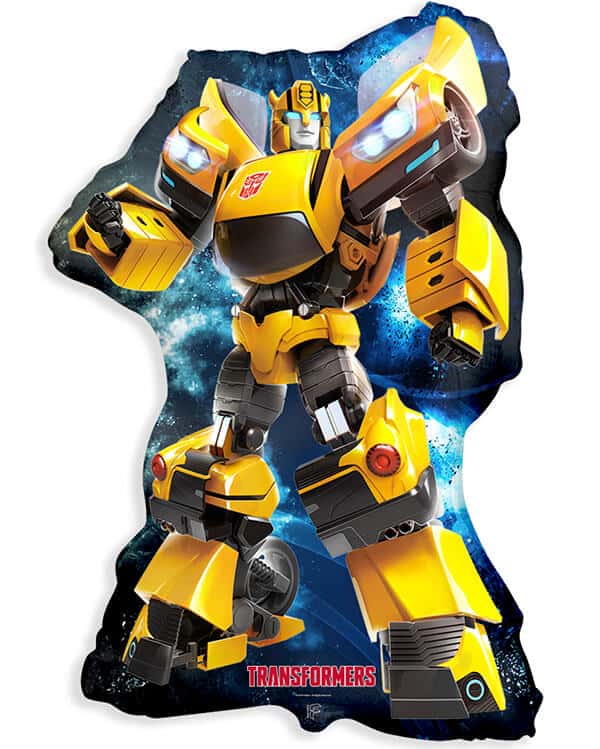 Большой набор по мультику трансформеры «Бамблби». Один фольгированный шар в форме трансформера «Бамблби» среднего размера. Можно повесить на стену. Один большой ходячий фольгированный шар высотой 1 — 1,5 метра в положении, стоящем на одном колене. В руках у него по одному букету из шаров. Букеты имеют одинаковое наполнение. Один букет состоит из латексных шаров без рисунка (2 — красного цвета, 2 — желтого цвета и 2 — черных). Один шар в форме звезды золотого цвета из фольги. Два шара прозрачных латексных с блестками красного и золотого цвета внутри. Один большой латексных шар прозрачный с красным и золотым конфетти внутри.