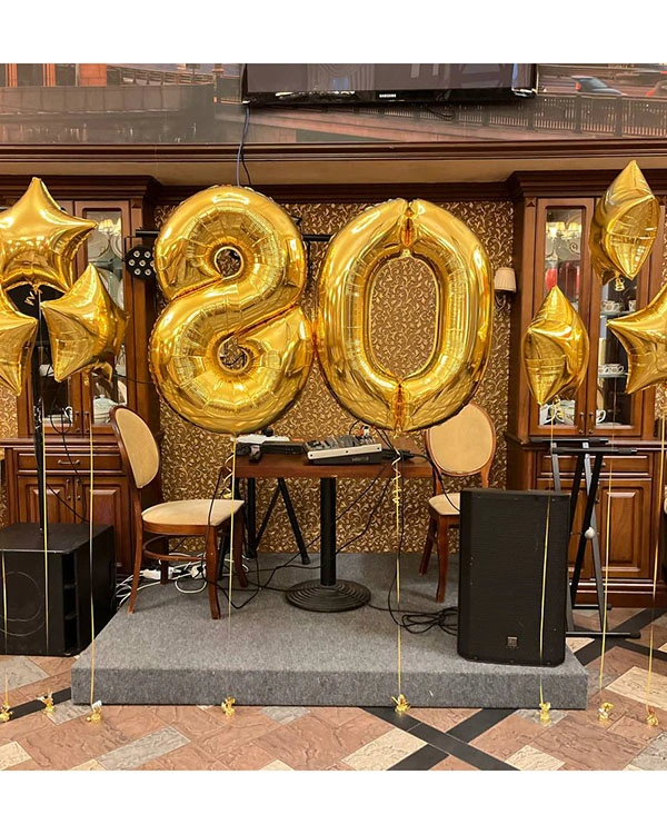 На юбилей готовый набор для оформления зала выглядит так. Одну из стен зала украшаем набором шаров из латекса с гелием золотого желтого и зеленоватого оттенков. Дополняем букеты шарами прозрачными с надписью «с юбилеем» и конфети внутри. Шары форменные фольгированные в форме звёзд золотого цвета размещаются выше шаров в букетах. По центру стены украшаемого зала размещаем цифирные шары, фольгированные с гелием в форме цифры юбилея (например, 50) и к ним добавляем фольгированный шар в форме золотой короны с надписью «с днем рождения».
