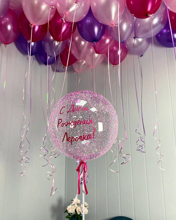Розового-фиолетвовый букет из шаров. В букет три латексных шара фиолетового цвета, три латексных шара розового цвета, два прозрачных шара из латекса с розовым конфетти внутри, одной звездой фиолетового цвета и одного розового цвета из фольги. Внутри шары заполняются гелием или воздухом по желанию покупателя.