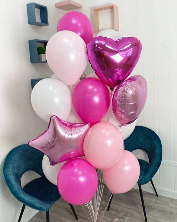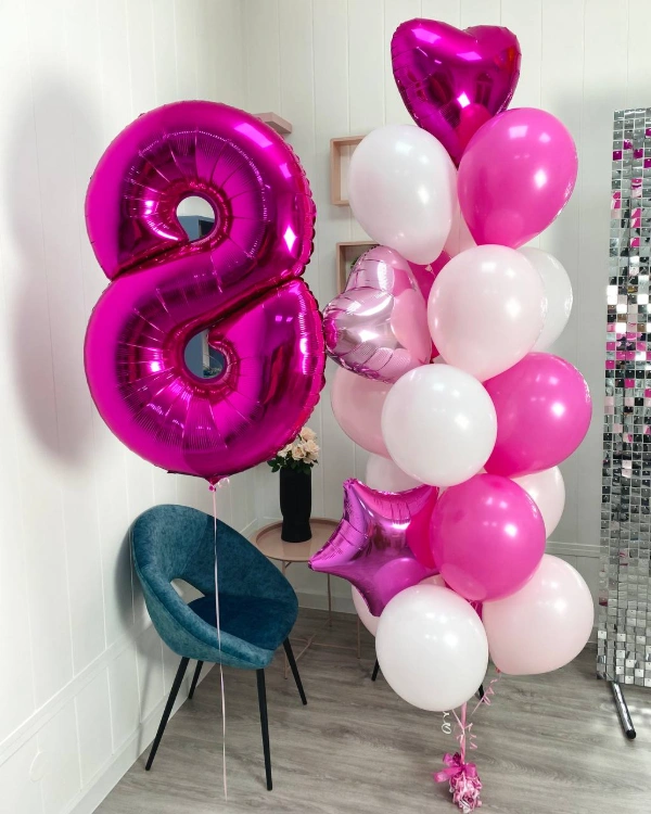 Набор из воздушных шаров для украшения комнаты ко дню рождению. В наборе один шар в форме цифры большого размера цвета фуше. Цифра указывается покупателем. Два маленьких букета из шаров. Один букет состоит из тех фольгированных звёзд (серебряная, цвета фуше и светло-розовая).