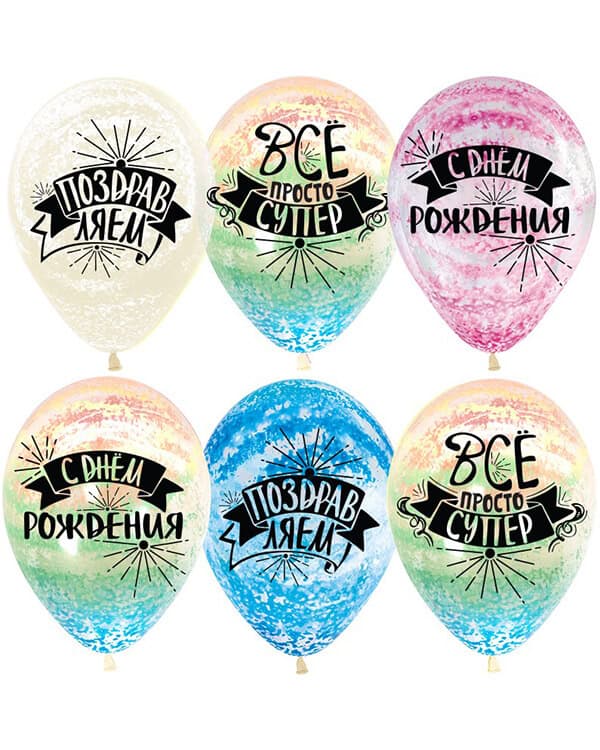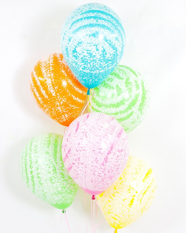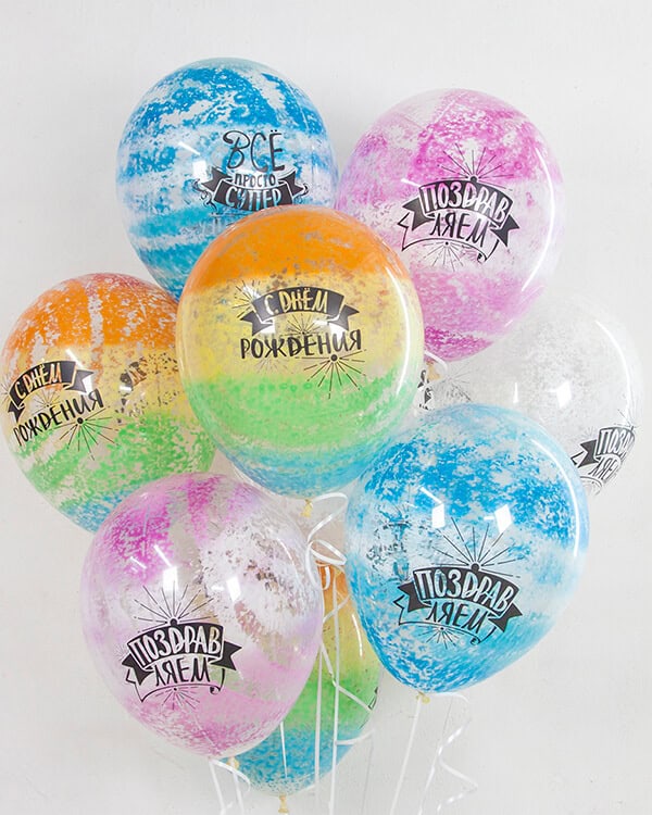 Радужный детский набор из шаров. В наборе 2 одинаковых букета шаров. В одном букете 6 шариков из латекса. Каждый шар окрашен в 2 смешанных между собой ярких цвета. Один шар оранжево-голубой, второй — желто-зеленый, третий шарик имеет фиолетово-белую окраску, четвёртый — красно-синию, а в потом смешались голубой и розовый. Заполняют шары по вашему желанию гелием или воздухом.