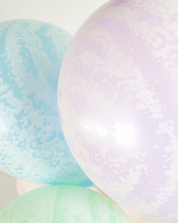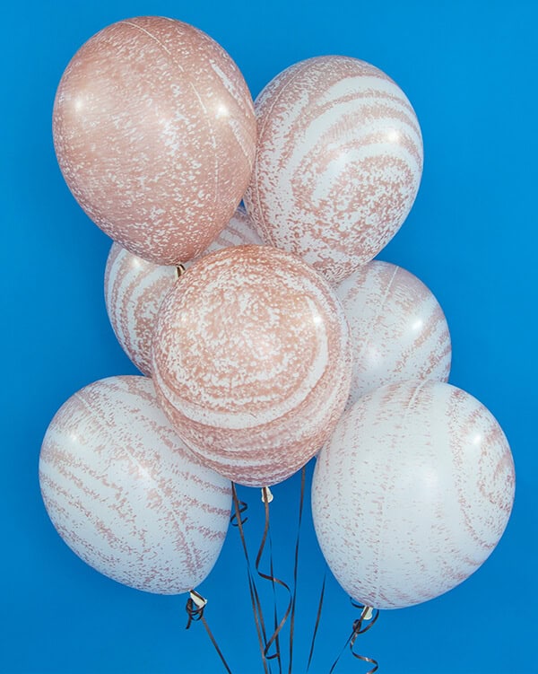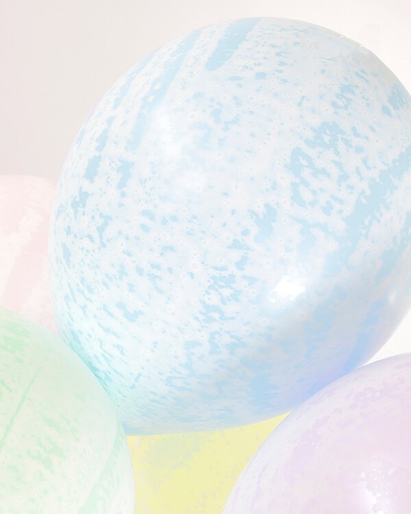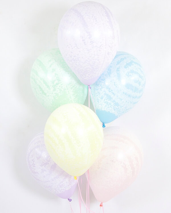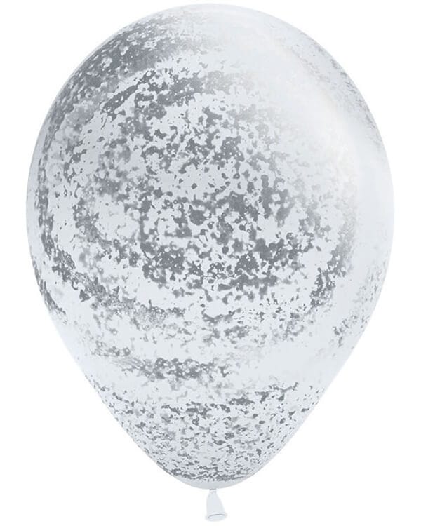 Мраморный набор из шаров. Количество шаров в наборе 8 штук. Они имеют черно-белую окраску, благодаря которой создаётся мраморный вид шарика. Материал из которых сделаны шары — латекс. Внутри они заполняются гелием или воздухом по вашему желанию. Они собираются в букет и связываются лентами белого цвета.