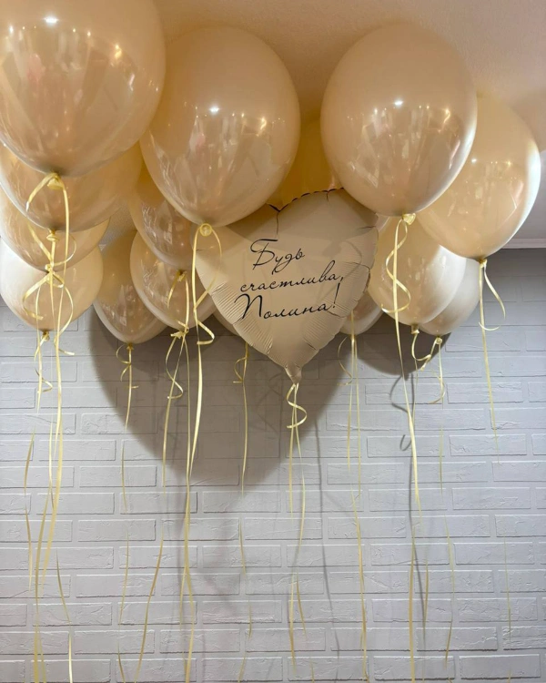 Набор шаров из двух букетов. Один букет содержит 11 шаров. Восемь шаров гелиевые из латекса белого, розового золотого цветов. Один шар прозрачный гелиевый с золотым конфетти внутри. Один фольгированный шар в форме звезды с гелием золотой. Один шар в форме сердца фольгированный розовый с гелием среднего размера. Между букетами размещаем шар большой прозрачный с золотым конфетти и надписью «невеста».