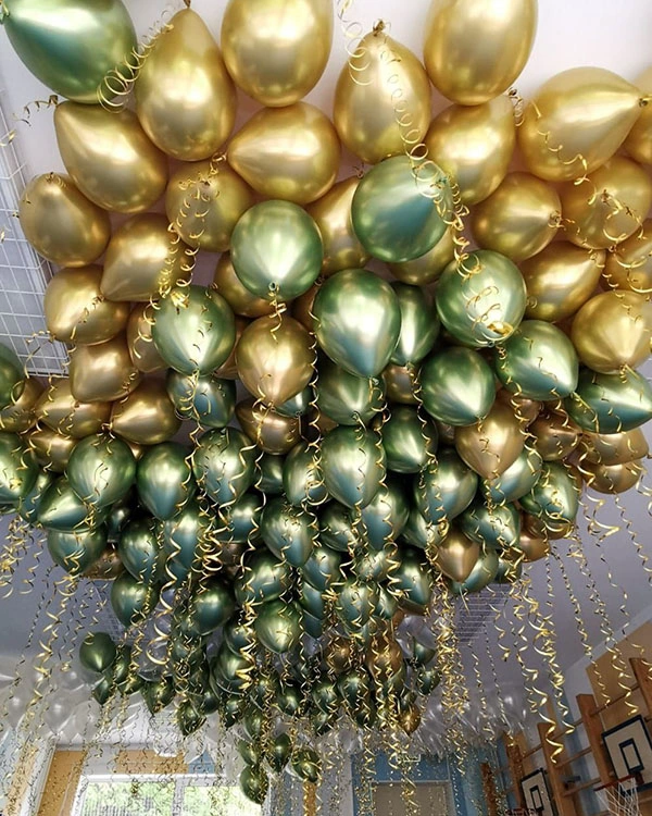 Набор шаров на корпоратив к десятилетию компании (для офиса). На входе в офис размещаем букеты из шаров гелиевых латексных белого и желтого цветов. Надпись на шарах «нам 10 лет». Стены коридоров украшаем гирляндами бумажными с текстом «спасибо, что с выбрали нас». Под потолок вешаем шары гелиевые фольгированные в виде цифры 10 золотого цвета.