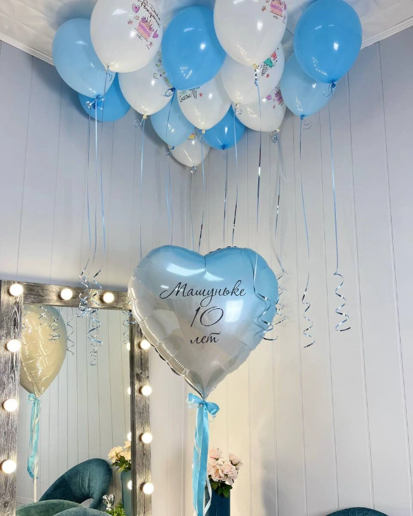 Шары под потолок сыночку. Шары в наборе гелиевые из латекса белого, голубого цветов. На некоторые из шаров наносим текст: «король песочницы, «рыцарь маминого сердца», «наш сын — наша гордость», «ты наше чудо — чуди!», «сияй как звезда!». В воздушные шары без надписей помещаем небольшие сладости. Шары в наборе гипоаллергенные, что позволит играть вашему ребенку с ними без вреда для здоровья.